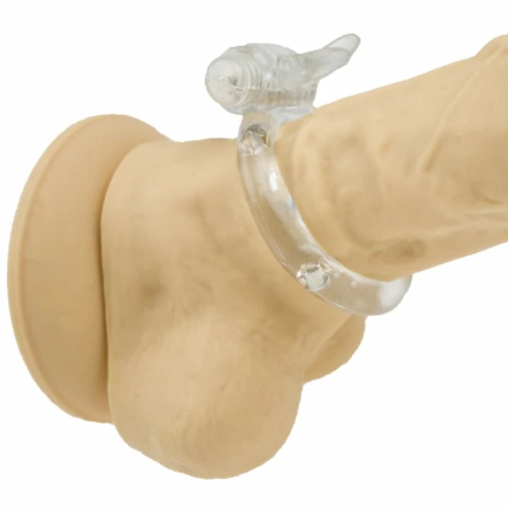 โข Clear jelly cock ring with vibrating rabbit stimulator.